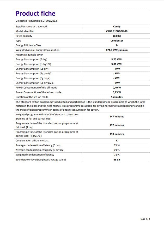 Details: The CSOEC10DCGR is a Candy Condenser Tumble Dryer in graphite and has a load capacity of 10kg and comes with 14 programmes to choose from. It also has a 4 clever sensor dry options which allows you to select the level of dryness required and will stop automatically as soon as your garments are dry. You can also use the Timed Drying function, which will let you set the cycle for a specific amount of time. Wi-Fi technology it allows you to connect to the machine via the hOn App on smartphones, allowing you to add additional programs, monitor cycles and run diagnostic checks.