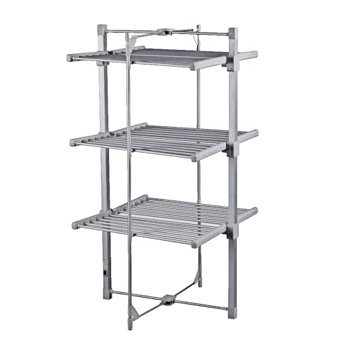 Details: PLEASE CHECK THE SIZE OF THIS AIRER TO ENSURE YOU HAVE ROOM TO USE THIS 78 x 72 x 138CM Also for the best results use in a ventilated room with cover to ensure GREAT ENERGY SAVING 3 Tier Electric Heated Compact Clothes Airer WITH FREE COVER Now Designed for optimum safety with the temperature being only 45-55 C Dry your clothes quickly with our brand new vented heat cover (included) Dry clothes more quickly in any weather Energy efficient, costing about 3p per hour 21 meters of extra drying space Lightweight aluminium Shelves can be fully or partially extended Folds away flat for easy storage Includes a fitted cover Our heated 3 tier folding Airer is a great household product made from strong aluminium. The versatile design means you can move the shelves to use just half if you don’t have the space and folds flat for easy compact storage. It’s perfect for drying your clothes whatever the weather with its 21 meters of drying space. Energy efficient it only cost 3p per hour to run unlike your standard tumble dryer. Furthermore, our sturdy 3 tier clothes airer includes a FREE cover that can reduce your drying time in half! Dimensions 78 x 72 x 138cm Surface Temperature: 45-55 degrees Material: Aluminium Voltage: AC220-240v Frequency: 50Hz Rated power: 220W Surface Temperature: 45-55 degrees Material: Aluminium