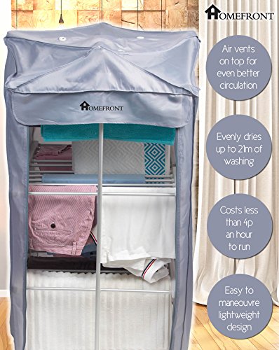 Details: Homefront EcoDry Electric Clothes Airer / Dryer Indoor Rack with Complimentary Zip Up Cover You probably already know that piling heaps of laundry on your radiators isn't a good solution. It creates condensation and very rarely dries your garments evenly. Hanging your clothes on the EcoDry is not only better for your clothes, but is also great for your environment. Studies have shown that up to 30% of moisture in our homes can be caused by drying wet washing. The EcoDry Electric Clothes Airer is the perfect drying solution for rainy days and for those who are compromised for space or simply don't have a tumble dryer. It's a high quality clothes drying rack with sturdy struts and joints that provides great drying results and makes washday that little bit less stressful! With a modern, contemporary grey and silver finish it's guaranteed to complement your living space too. The complimentary EcoDry Zip Up Cover has a functional zip up front panel for easy access and the mesh vent allows better airflow to aid even faster drying. The EcoDry is one of the most versatile clothes drying racks on the market. It's tall and slimline design makes it perfect for space-compromised homes and provides an eco friendly, effective way to evenly dry your washing indoors. With versatile open-sided shelves that provide easier access, you can make use of the full clothes dryer rack and even fold some of the shelves away when not required to take up even less space. It's also really easy to store away when not in use: fold it up and store it under your bed or in your cupboard. The free zip up cover also provides a neat and tidy solution for hiding your washing from visitors! Costing less than 4p an hour to run, this electric clothes horse is kind to your purse and is even kinder to your garments in comparison to using a tumble dryer.