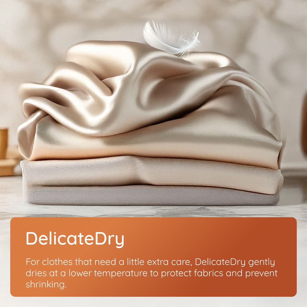 The DelicateDry programme gently dries clothes at lower temperatures to help prevent shrinkage and fabric stress. It’s perfect for delicate garments, helping them maintain their shape, softness, and quality over time.