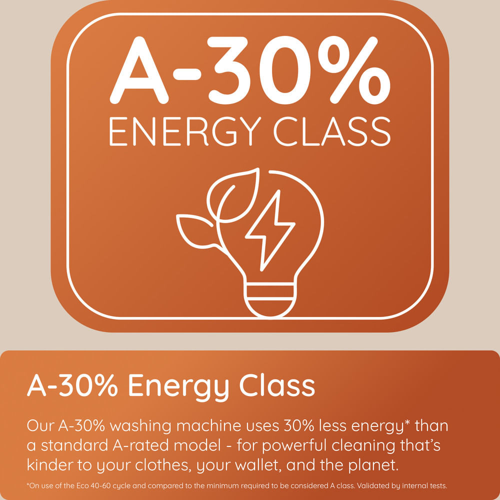 With an impressive A-30% energy rating, this washing machine uses significantly less energy than standard A-rated models. It delivers powerful cleaning while helping reduce energy bills and environmental impact.