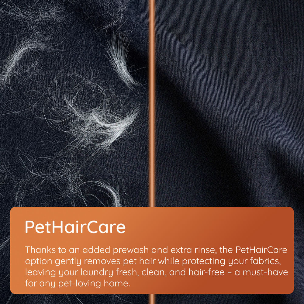 The PetHairCare option is designed to tackle stubborn pet hair that clings to clothes and bedding. An added prewash and extra rinse help loosen and remove hair while remaining gentle on fabrics, leaving laundry cleaner, fresher, and more comfortable to wear.