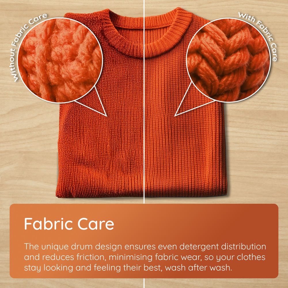 Fabric Care technology is designed to reduce friction during washing, ensuring clothes receive a thorough yet gentle clean. The unique drum design allows detergent to distribute evenly, minimising fabric stress and helping garments retain their shape, texture, and comfort. This makes it ideal for everyday items you want to keep looking and feeling their best wash after wash.