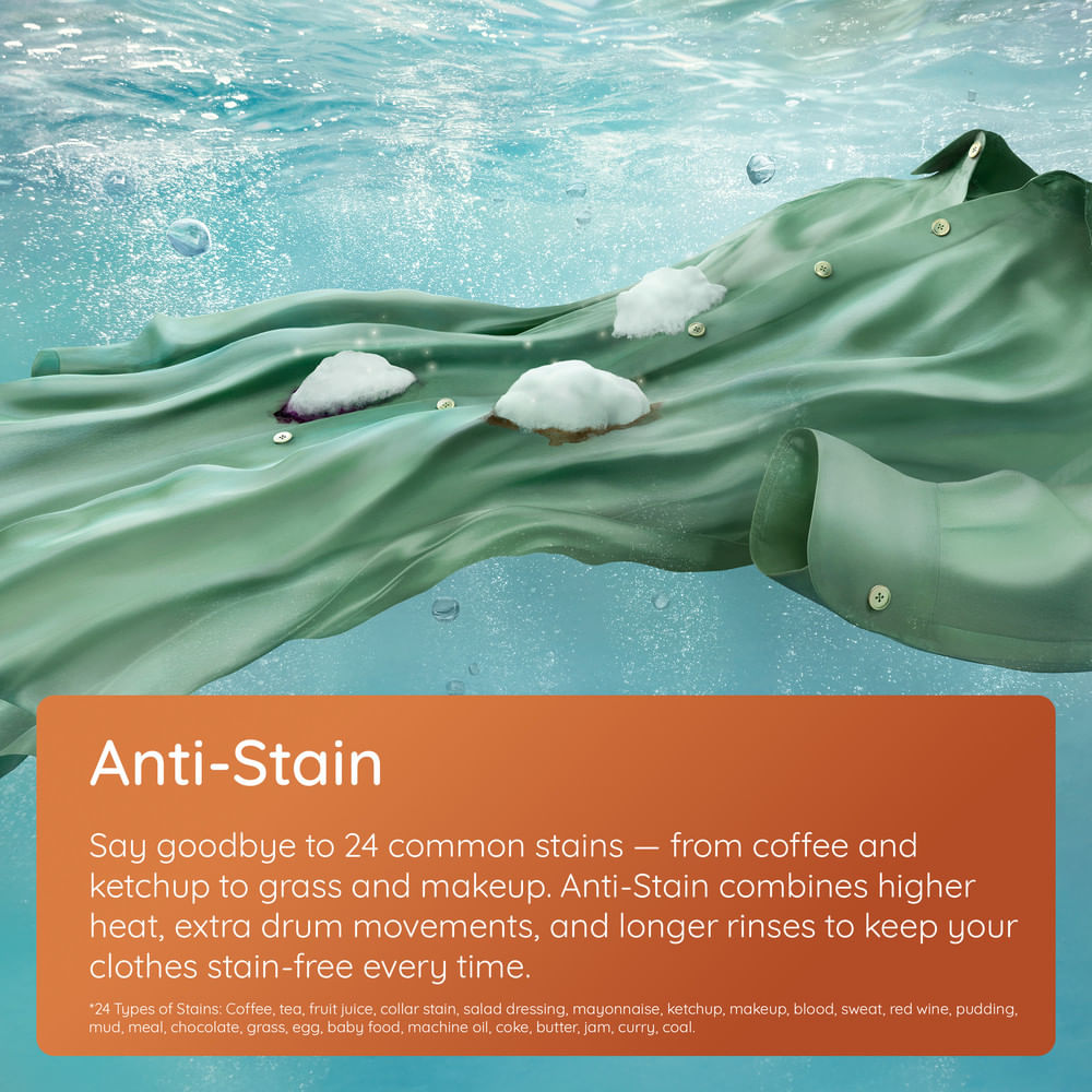 The Anti-Stain programme is built to handle common household stains through a carefully balanced combination of temperature, drum movement, and rinse action. It removes stubborn marks without the need for pre-treatment, making it easier to keep clothes clean even after spills, outdoor activities, or busy days.