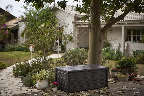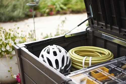 An ideal outdoor storage solution that’s big on capacity and big on style. The brightwood storage box provides 454 L/120 G of storage space and has a durable and weather-resistant plastic build that resists damage to keep contents such as patio accessories and lounge chair cushions safe. The brightwood storage box, with its elegant wood-panelled appearance, features an automatic opening mechanism that makes opening and closing easy. As well as this it also provides comfortable seating for two adults if that extra seating is needed when entertaining.