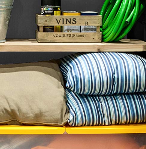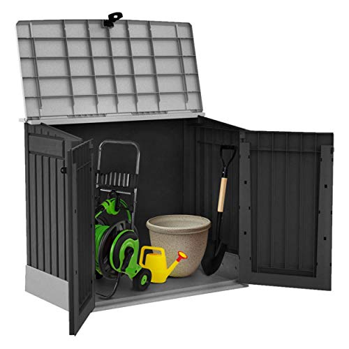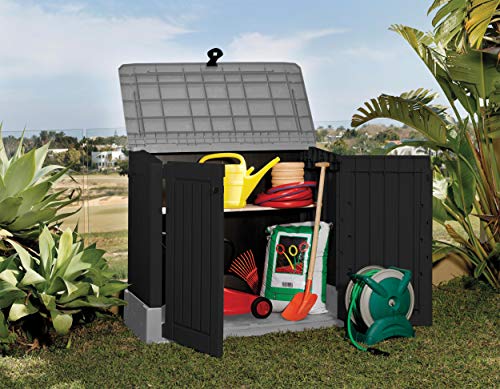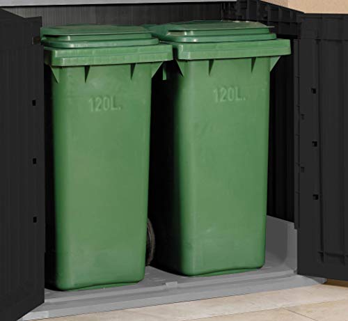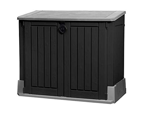Details: Store it Out MIDI The practical storage bin in wood look - great for storing a variety of garden accessories About Keter With its products, the Keter Group has been one of the leading manufacturers of plastic products for over 60 years. The core range of Keter products includes garden furniture, children's items and storage systems for household, garden and do-it-yourselfers. The Shed With a total capacity of about 0.85 m³, two waste cans with up to 120L can be stored easily. With 2 large doors and the hinged lid with integrated gas springs (there is no way that the lids can drop down), your items can be easily stowed away. The inner side walls are designed so that a wooden board (not included) can be installed as a shelf. This give you the opportunity to store small things. For extra security, the Store it Out MIDI can be locked (padlock not included). Dimensions (LxWxH): 132 x 74 x exterior about 110 cm | interior approximately121 x 64 x 104 cm The material The Store it Out MIDI is made of UV and weather-resistant, high-quality plastic (100% polypropylene) manufactured in an injection moulding process. Sun, rain and even snow cannot damage the plastic and so the Shed can be kept outdoors all year. Snow load: up to 75 kg Why you should choose a product made of plastic? We give you five reasons: Colourfast - The colours of plastic are colourfast; even after years of outdoor use, the plastic retains its beautiful colours. | Durable - The plastic items are intended for long-term and heavy use. With minimal care, you have years of enjoyment. | Weatherproof - Articles made of plastic have no problem with the blazing sun and rain. | Clean in a jiffy - Virtually maintenance free: It is enough to clean the items now and then with a mild all-purpose cleaner and a brush or just rinse them off with the garden hose every now and then. | Recycling - The plastic items are fully recyclable. Your item can take on a function at any time. This makes its impact on the environment minimal. Specifications Colour: black/grey Wood look incl. base plate Basic dimensions of the base plate: 130 x 74cm | 1.0 m