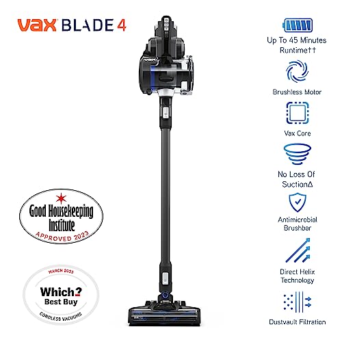 Details: CLEANING PERFORMANCE OF THE BEST CORDED UPRIGHTS WITH NO COMPROMISE** Powered by the ONEPWR 4.0 Ah MAX battery & the VAX Core controlled brushless motor, in combination with innovative design and a specially designed carpet floorhead gives VAX Blade 4 the cleaning performance of the best corded uprights & the freedom of a cordless vacuum. NO LOSS OF SUCTION VAX Blade 4 maintains constant high pick-up performance even when the dirt bin is full or the battery is low. LIGHTWEIGHT AND INNOVATIVE DESIGN At just 3.1kg, VAX Blade 4 is perfectly balanced for effortless, easy to use cleaning. Offering the performance of a corded vacuum in a sleek lightweight design. REMOVABLE ONEPWR 4.0 Ah MAX BATTERY Generating up to 45 minutes runtime per battery, there is plenty of time to clean without recharging. VAX Blade 4 provides continuous cleaning performance and, if that is not enough, you can simply switch out for another ONEPWR battery and keep going INNOVATIVE BRUSHLESS MOTOR VAX Blade 4 ’s new brushless motor is the perfect balance of performance and intelligence. Controlled by VAX Core Technology, the 32 bit micro-processor continually monitors power to maximise cleaning efficiency & performance. VAX BLADE 4 REMOVABLE BIN Simple, hygienic and easy emptying. No more awkward manoeuvring or unnecessary carrying of your whole machine to the bin when you need to empty the debris. Simply pop off the removable bin and empty. 3 HOUR FAST CHARGE Ready to use in just 3 hours, or less if you just need a quick clean. With our ONEPWR battery, multiple batteries means no more hanging around waiting for your battery to charge. DUSTVAULT 3 stage filtration technology ensures that even the smallest particles of dust are captured in the dirt bin, dual cyclones remove dust, and a dual layer electrostatic filter captures the finest particles. Capturing up to 99.8% of particles down to 0.3 microns in size. DIRECT HELIX TECHNOLOGY Provides three-dimensional support inside the horizontal dirt bin, this also intersects with the axis of the cleaning wand giving a direct air path from the floor to the cyclone for maximum performance and efficiency. WHOLE HOME CLEANING The lightweight, detachable handheld is perfect for stairs, pet hair removal, cars and upholstery cleaning. The cleaning wand is easy to elevate into those hard to reach areas, yet flexible enough to reach all those awkward spots – up high, down low or in-between. BOOST MODE Up to 3x the power† at the touch of a button giving you the very best cleaning performance, when you really need it. CORDLESS CONVENIENCE ON ALL FLOOR TYPES The specially designed floorhead on VAX Blade 4 gives you excellent cleaning performance on all types of flooring. VAX Blade 4 is cordless meaning you can move from surface to surface or room to room without the hassle of plugging and unplugging. ** UK market data, Jan 2019 - Dec 2020 (by sales volume), when tested on carpet and hard floor according to IEC 62885-2:2016 clauses 5.2 and 5.3. Tested in Boost Mode. For further information Tested according to IEC 62885-2:2016 clause 5.7 and 5.9. †† Tested in standard power mode on hard floor, with floor brush switched off. † Maximum suction power, tested according to IEC 62885-2:2016 clause 5.8. Tested in Boost Mode. Tested according to EN60312-1:2017 Clause 5.11